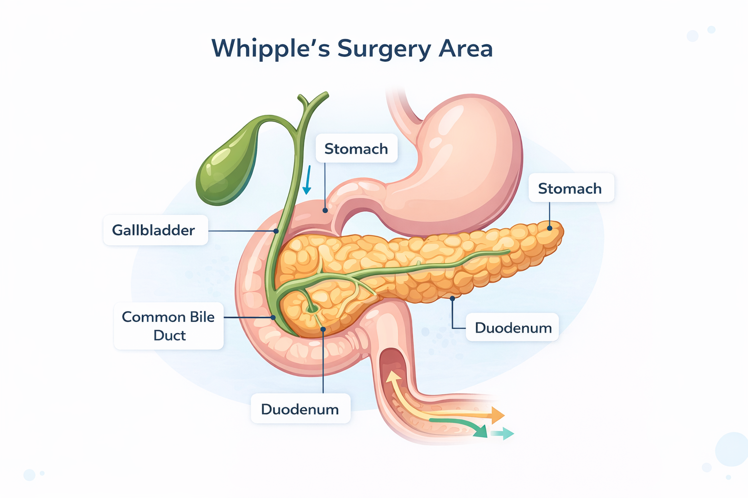 Whipple’s surgery, also called pancreaticoduodenectomy, is a complex operation performed for select conditions involving the head of the pancreas, duodenum, bile duct, and sometimes the stomach. The operation involves removing affected parts and then carefully reconstructing the digestive pathway so that food and digestive juices can flow again.