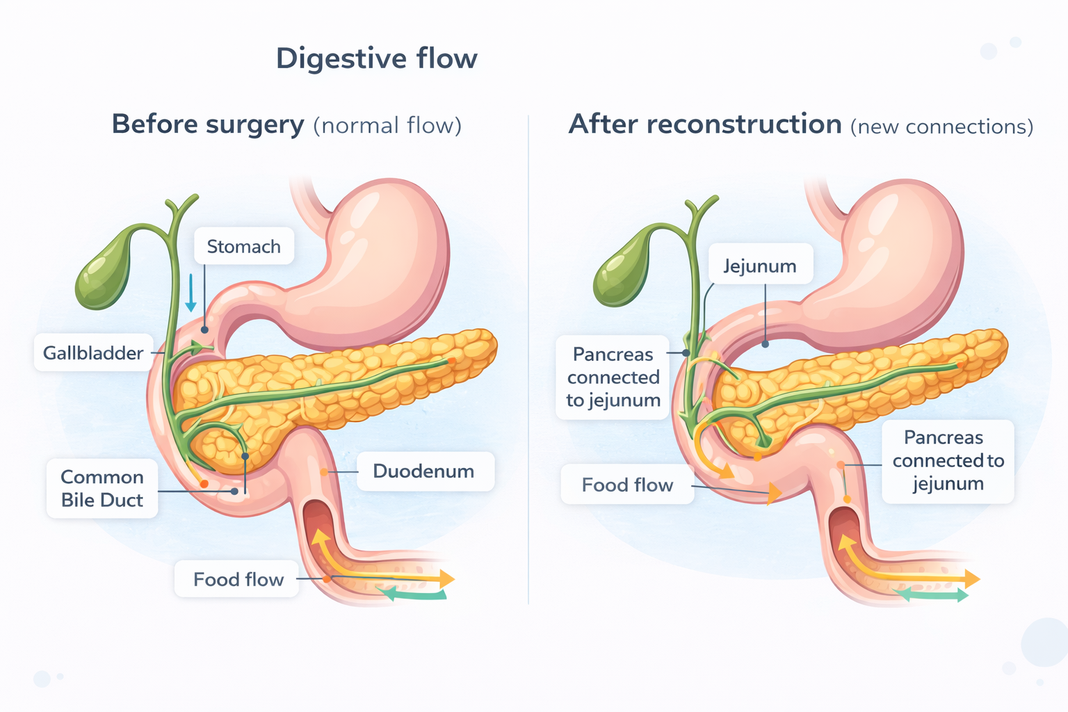Digestion can take time to adjust because the pathway is reconstructed. Diet is usually progressed step-by-step, and some patients may need additional support depending on symptoms and nutritional status.